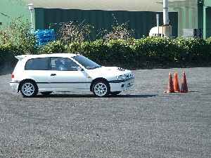 | おおいずみさんのGTI−R。今回も前回と同じく的確なライン取りでした。この画像は、ポールギリギリをうまく捉えて180度回転している所です。とても4WDとは思えない動きです。(^_^;) |