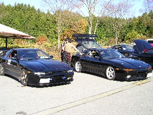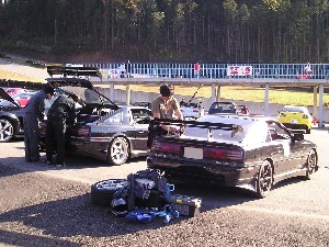 しのいサーキット到着後すぐに走行準備をはじめるおいらと001さん。 サカイさんがままま号のトランクの中を覗き込んでいます(笑)。 001さんは黙々とテーピング作業に取り掛かっています。 |