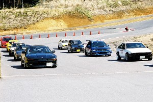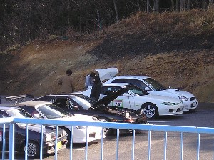 ままま号の奥側に停まっているクルマは、一緒に走ることになった弟の友人たちです。 しのいはテクニカルなコースなので、シルビアやインプレッサはかなりの強敵です。 |