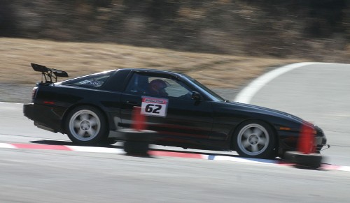 cinさんに撮影してもらったままま号。 シケイン直前でブレーキングして、これからステアリングを切り始めようとしているところですね。 ぐいっとフロントが沈み込んでいるところがよく分かると思います。 |