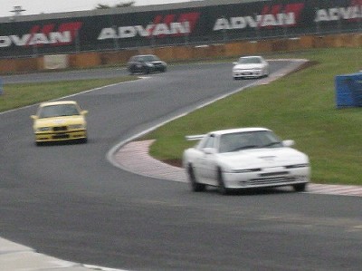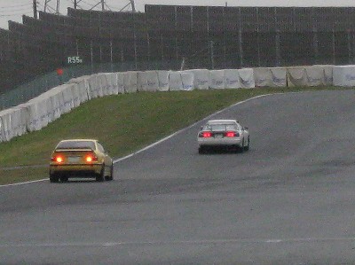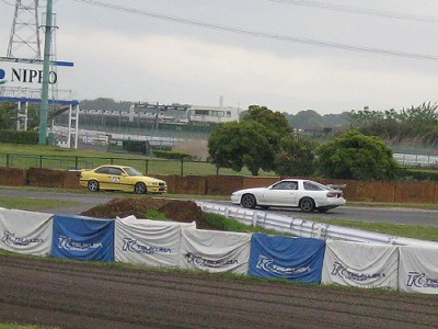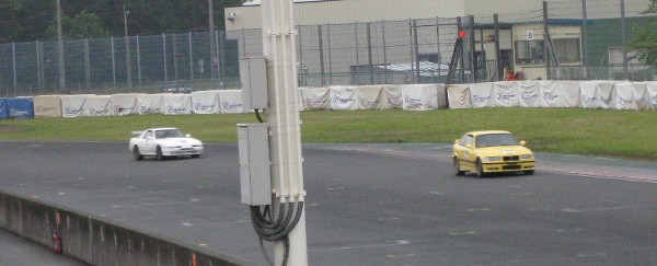 そしていきなり第3ヒートでの写真。 というのも、これより前は大雨で外に出られないほどだったからなのですが。(^_^;) 画像は夢郎号とすぷら号が第1コーナーに向かっているところ。 この時夢郎号のラインを教えてもらったそうです。 |