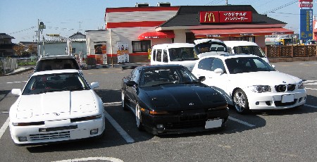 筑波サーキット近くのマクドナルドで集合。 走行前の腹ごしらえはいつもココ! ままま号の右隣はかんちゃんのBMWです。 今回は3つ巴戦があるということで観戦しに来てくれました!(^^) |