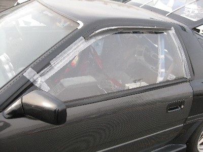 時速150キロを越えたあたりでアクリルウィンドウが外側に反ってしまう問題を解決するために考えたのがコレ(笑)。 不要な空気抵抗を減らすには効果があったのですが、、、新たな問題が、、、。 中のドライバーは自力で外に出れなくなる、、、というものです。(^_^;) これはサポートのかんちゃんが居ないときにはできない技です(笑)。 |