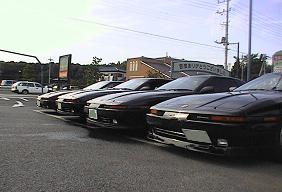 柏オフの70スープラによる集合写真。 手前からサカイ@JZA70さん、亀山さん、ミツさん、まままの順に並んでいます。 |