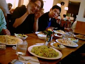 お昼ご飯はスパゲティーでした。お腹がすいていたので大盛りを頼んだら、こんなに山盛りで出てきました(爆)。 なんとか残さずに食べきったけど、しばらくはスパゲッティは食べなくても大丈夫そうです。(^_^;) いつもたくさん食べるスガさんがとても嬉しそうですね〜(笑)。 |