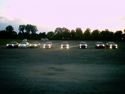 日が暮れてきてから最後まで残っていたクルマたちでヘッドライトをつけたところです。 クルマの間隔がバラバラなのはいつものことなので気にしないで下さい(爆)。 |