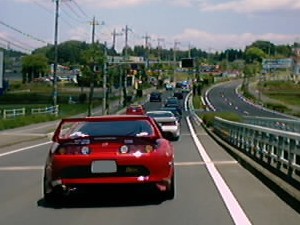 高速部隊と合流して水戸軍団との合流地点まで向かう途中の様子。オー○ス手前でみんな慎重に進んでいます(爆)。 ちなみに手前の赤い80スープラはおにむしさんのマシンです。イカツイですね〜。知り合いじゃなかったら間違いなくアオリ倒します(爆)。 |