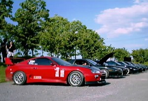 左から順番にスープラ達を撮影しました。画像はたいらあさんから提供してもらいました。ありがとうございます。m(__)m 左から、おにむし号、サカイ@JZA70号、TEMMYE号。サカイ号の室内に向かって誰か二人が顔を突っ込んでいます(笑)。 |