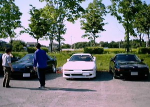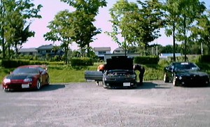 左から、サムライ号、001号、tetu号。 赤い服を来たセクシーな後姿はす〜むす。さんです。画像でドアップで写っているのはミツさんです。この日は001さんと一緒にLSDについて熱く語り合いました。そして、ミツさんにはドリフトの実演指導までしてもらっちゃいました。(^^) |