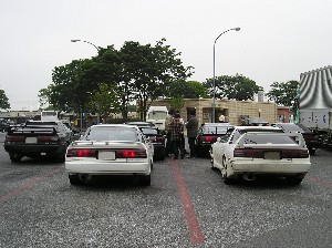 飛び入りJZA号。 ターボAダクトを装着した2.5ターボRです。おいらと同じTEINのHA車高調を装着しています。 このアングルからだと分かりにくいですが、相当なシャコタン仕様となっていてスパルタンな印象を受けます。 |