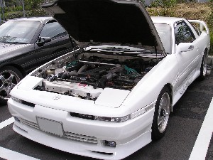 フロントバンパーにデカイ穴を開けてオイルクーラーが丸見えのなおちゃんさんのスープラ。 インタークーラー前に持ってくるのははじめて見ましたが、パワーよりも冷却を中心に考えるとこの選択は正しいように思います。 |
