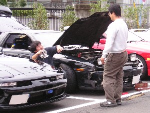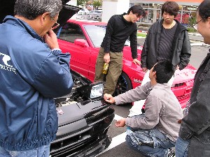 新製品のホイール磨き剤でひたすらホイールを磨いていた001@TAKAさん(笑)。 磨きに関してはプロ級の亀山さんも興味津々といった感じでした。 |