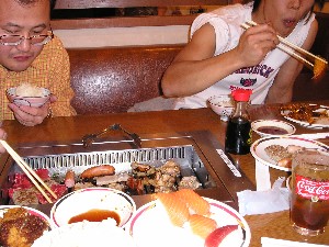 タバコを吸わない人たちのテーブルでの焼肉食い放題の様子(笑)。 画像右側で見切れているのはゆうきさんです。 真ん中手前のお皿には、おいらの大好きなサーモンの寿司が満載されています(笑)。 実はおいらと001さんは二人ともサーモンの寿司が大好物だということが判明しました(爆)。 |