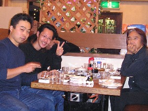 遅れて合流したたかぴょんさん。 めちゃめちゃ笑顔の飛び入りJZAさんの後ろに隠れているのはあっくんです(笑)。 スガさんはすでに食べ終わって一服中といったところですね。 |