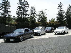 蓮田PA。 手前から飛び入りJZA号、たかぴょん号、かんちゃん号、一番後ろがサカイさんのGTR。 トラックで見えませんが、スガさんのセルシオも左の方に停まっていました。 |