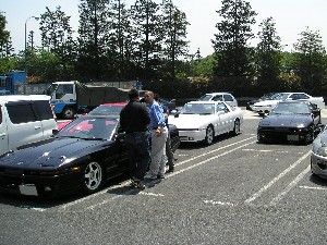 さんぺいさん一行と合流! 予想外の展開にみんな驚いていました。 ままま号の奥に停まっている赤いスープラがlain号。その隣が夢朗号。更にその隣がさんぺいさんのスープラです。 |