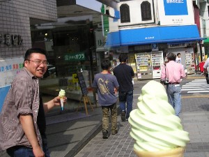 去年の餃子オフから恒例になった抹茶ソフト。 前を歩くtatuさんたちは、巨大なソフトクリームが背後から迫っていることに気づいていない、、、(爆)。 |