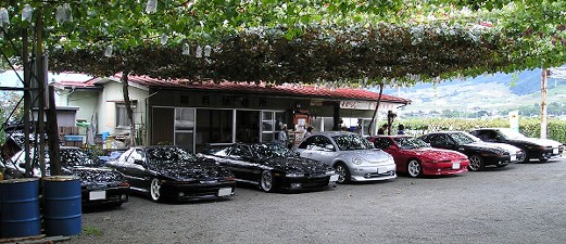 第一集合場所の談合坂SAでそろったクルマたち。 雨が降ったりやんだりと不安定な天気でしたが、山梨に着く頃にはいい天気になりました。(^^) |