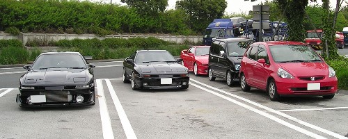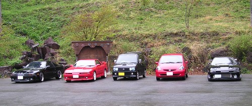 第1集合場所での集合写真! 70スープラと通りすがりのクルマたち、、、ではありません!(爆) 手前からlain号、ままま号セカンドマシン、Suga号です。 |