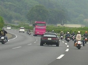 東北自動車道を北上するとバイク軍団が! そこにごすけ号が乱入! バイク軍団が全員振り返る様子を後ろからず〜っと観察してました(笑)。 |