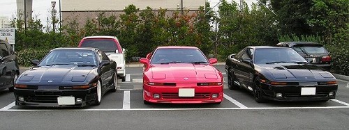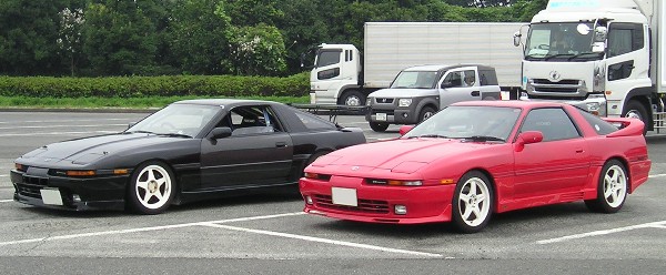 海老名SAでの2台のスープラ。 入り口そばの駐車場は激混みですが、出口付近はガラガラ。 ツーリングやオフのときは奥側に停めるのが賢いやり方でしょう。 |