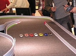 ミニラジコンでレース開始前の瞬間! ラジコンの酔払い運転はOKなのです(笑)。 最近はこんな小さなラジコンでもめっちゃ速いんですね〜。 みんな騒ぎながらも一心に操作に夢中になっていました(笑)。 |