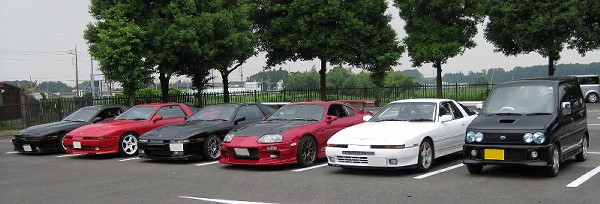 集合場所の羽生PAで記念撮影。 今回初参加のラフさんの80スープラが目立ちますね〜。 ちなみに、おいらが羽生PAに入るところをしっかりロックオンされてました(笑)。 |
