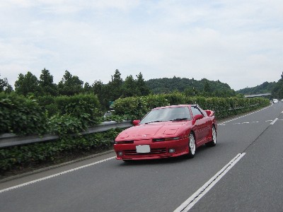 白い70スープラ夢郎号。 このあと北関東自動車道で気合が入りすぎてエンジンカバー脱落に。(^_^;) いつか見た光景です(笑)。でもそこは慣れっこで落ち着いて対処する夢郎さんがいました(爆)。 |