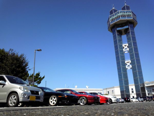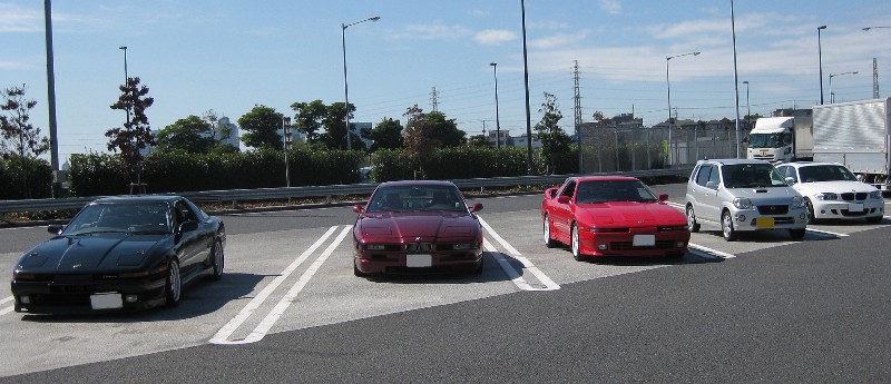 集合場所の幕張PAでの記念撮影! トラック用の広いスペースをふんだんに活用して贅沢な停め方をしています(笑)。 ちなみに、左から2番目のクルマは、一見して70スープラに見えますが違います(笑)。 |