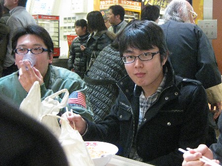 カレーをむさぼる夢朗さんとカメラ目線のlainさん。 夢朗さんもやっぱり辛いものへ(笑)。 この日は寒かったせいもあって温かくて辛いものが売れていましたね〜。 |