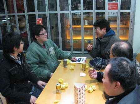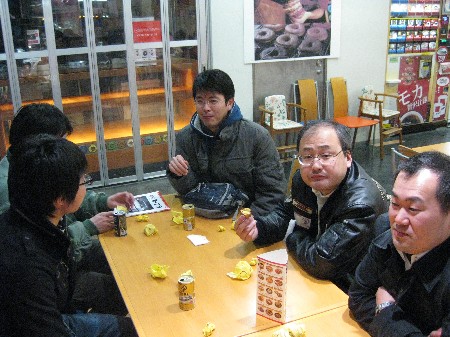 差し入れの温泉まんじゅうを食べながらダベりタ〜イム! lainさんはまたもやカメラ目線です(笑)。 一番手前はthorさん。詠み方は「とーる」さんです。あ、知らなかったのはおいらだけですね。(^_^;) |