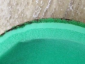 これが3層スポンジ! 真ん中の層が新しく追加されているようです。 一番目が細かいというのが分かりますね。これがリストラクターとなってパワーダウンとなります。(^_^;) 満足度20%、、、。 |