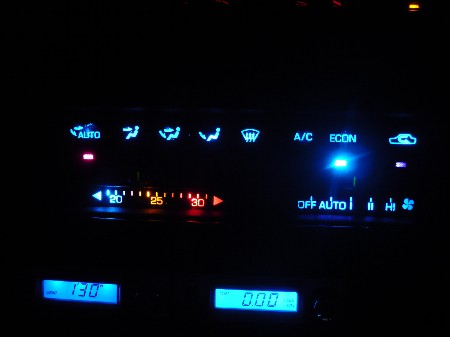 『風量』の取り付けです。 ここは純正のユニットを取りつける場所ですので、なるべく奥に両面テープで固定します。 光がムラにならないようAC/DCアダプターを使い点灯しながら位置を決めます。 |