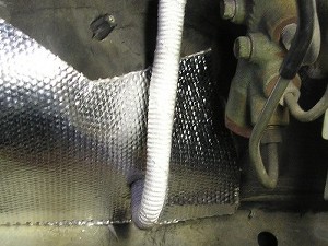 ブレーキラインの遮熱チューブとストラット周りの遮熱はこんな感じ。 タイヤハウスの内側に少しはみ出すように突っ込んであげれば、ずれることなく固定できます。 心配ならステンの針金などを使うといいかも。 ストラット周りの遮熱布は1.6mmタイプを使います。 貼り付ける前にブレーキクリーナーなどで脱脂しておくのを忘れずに! |