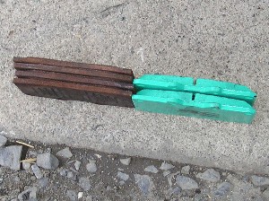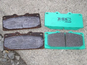 左が外したパッドで、右側が新品パッドです。 サビ&ダストで真っ黒になってますが、正真正銘同じブレーキパッドです(笑)。 すでに真ん中の溝が無くなっています。(^_^;) |