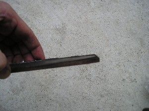 一番薄くなっているパッドの拡大画像! パッドの厚みは0.2mmくらいしかありません(笑)。ブレーキパッドの残りが少ないのを知っていながら、どこまで耐えられるか試したものですので、良い子の皆さんは真似しないでください(爆)。 |