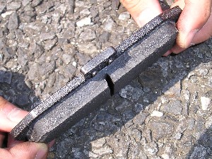 座金に付いているデッパリに注目。パッドの残りが少なくなった時にローターに当たって分かるようになってます。 トヨタの純正パッドとかには付いていますが、社外のパッドでは珍しいかもしれません。 |