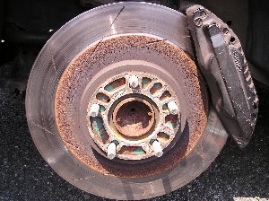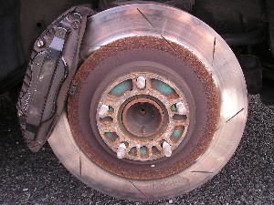 運転席側のローター。 取り付けた直後はこれくらいのローターの減り具合です。 これが数ヵ月後にどうなるか?!(笑) |
