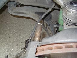 確実に組み立てが完了した事を確認したら、キャリパーを組み付けます。 ブレーキラインをねじれない様にキャリパーに装着させます。 ちなみに微妙に黒光りしているのは、ブレーキフルードを吹きまくった直後に撮影したからです(爆)。写真は左側ですが右側も同様の作業をします。 |