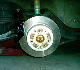 キャリパーとローターを取り付けたところです。純正の時の画像と比べてみても大きさが全然違うことが分かりますね〜。 先ほど説明したサイドブレーキのシューの調整は、ローターのハブボルトの穴と穴の間に空いている穴にマイナスドライバーを突っ込んで行います。初め見た時に、この穴はなんだろう?と思ったのですが、最後になって、なるほど!と思いました(笑)。 ダイヤルの調整量は、シューがローターに密着した状態から、8コマ戻すのが良いようですが、これはシューの残り量によって変わってくるようなので、テスト&トライを何度か繰り返す方が良いと思います。 |