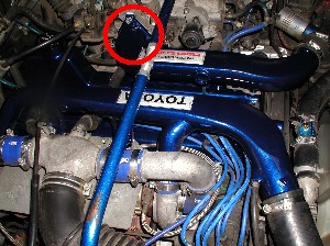 | 吸気菅類のクランプを緩め、吸気菅を留めているボルトを外します。 本来タワーバー等は外して作業するのでしょうが、体の大きい私は無理無くセンターまで手が届くのでタワーバーを外すなんて面倒な事はしません(爆)。 |