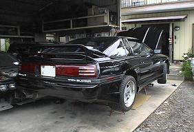 スープラをジャッキアップして、全輪とも浮かします。 リフトがあるとホントはもっと楽ですよね〜。 あと、バッテリーの端子もはずしておきます。 |