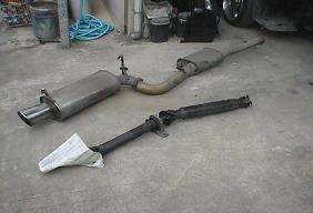 マフラーとプロペラシャフトをはずしました。 オイルが垂れてくるので新聞紙などで押さえた方がいいですね。 プロペラシャフトって結構軽いのでビックリしました。 |