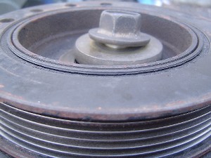 外したクランクダンパープーリーの拡大写真。わずかな亀裂が見えます。
