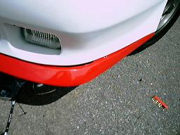 リップスポイラーのこの部分にはボルト穴がありません。フロントバンパー側にはちょうど良い具合に穴があったので、それに合わせるように穴をあけることにしました。 しかし、穴をあけるキリが無かったので、小さいドライバーで少しずつ穴を開けていく作戦をとりました(笑)。 |