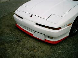 斜め前から見た所! くぅ〜、かっこいいじゃないですか〜。 ホワイトのボディに赤いリップスポイラーってに合うと思いませんか? 車高も落ちているので、更に決まって見えますね〜。 |