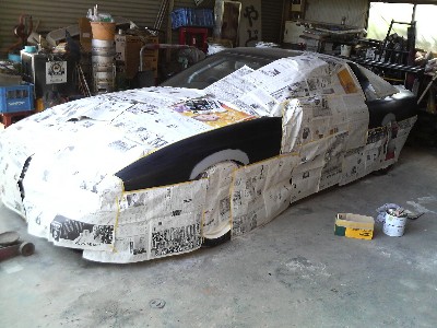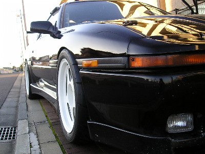 フェンダーの叩き出しはうちの実家のオヤジに依頼しました。 SOCのワイドフェンダーという選択肢もありましたが、値段がちょっと高くて手が出ません。(^_^;) それにおいらはフロント回りはできる限り純正スタイルを維持したいと思っていたし、 持ち込んだホイールにピッタリあわせてワイド化できるので満足度も高いです。 |