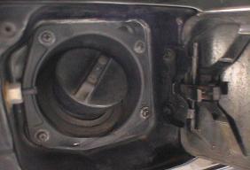 燃料タンクをはずす前にキャップをはずしてタンク内の内圧を抜きます。 キャップの周りにあるねじを4本はずしてください。 それから、トランクの中にあるフタをはずし、カプラーをはずしておきます。 |