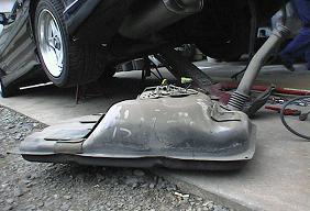 燃料タンクを下ろす前にガソリンをドレンから抜きます。 マジで重いです(笑)。 (燃料フィルターだけ交換するなら、タンクは下ろさなくてもいいかも?!) 全部抜いても重いので誰かに手伝ってもらうことを勧めます。 あと、ドレンを空けた途端にガソリンをかぶることになるので覚悟してください(爆)。 |