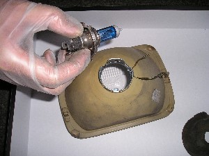 ヘッドライトユニットの裏側。 ゴムのカバーを取り外すとバルブを留めているクリップがあるので、これを横にずらすように外せばいとも簡単にバルブを取り出すことができます。これでハロゲンバルブとはおさらばです(笑)。 手袋をしているのは、誤ってバルブの表面を触ってしまわないようにするためです。サムライさんが事前に準備してきていました。用意周到ですね〜。 あと、ガラス面を下側にして作業するので、傷つけないようにHIDが入っていた箱をひっくり返してその中で作業しました。 |